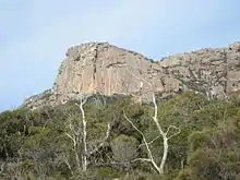 Devonian granite is the dominant rock type at Freycinet.[4] Orthoclase, a pink feldspar, gives the mountains and coastline their characteristic pink tint.[4] Black micas and white quartz are also found.[4] The western side of Schouten Island is composed of Jurassic dolerite.[4]