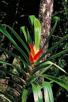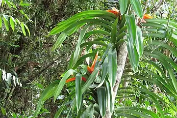 Freycinetia marginata is an evergreen root climber with a stem diameter of up to 3 cm (1.2 in), which is held tightly to its support substrate by numerous adventitious roots.[4][5] The leaves have fine longitudinal veins and are green with a purplish hue. They are long and strap like, measuring up to 150 cm (59 in) long by 8 cm (3.1 in) wide, and the margins (edges) may have small spines or teeth.[4][5] The leaf bases are expanded laterally to form ligules, that is, thin membranous extensions of the leaf blade which overlap with neighbouring ligules, creating traps for water and biotic debris.[4]