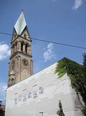 The first Friedenskirche was built for the Lutheran parish in the centre of Stuttgart from 1890 in neo-Romanesque style, with a double choir and narrow gallery and ceiling supported on wooden columns,[1] to designs by architect Conrad Dollinger,[2][3] and consecrated on 11 December 1892.[3] The tower, in the middle of the nave,[1] was decorated with sculptures of apostles and Christ blessing.[3]