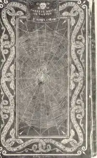 A thousand copies of A Treatise on Adulterations of Food and Culinary Poisons were sold within a month of its publication.[32] A second run was printed in the same year, and a German translation was printed in Leipzig two years later. The book's cover shows that Accum was capable of using dramatic imagery to try to draw attention to his scientific knowledge. It featured a rectangular frame supporting a spider's web and surrounded by intertwined snakes. A spider lurks in the middle of the web over its prey, and a skull crowns the entire collection with a caption beneath it, taken from 2 Kings 4:40: "There is death in the pot."