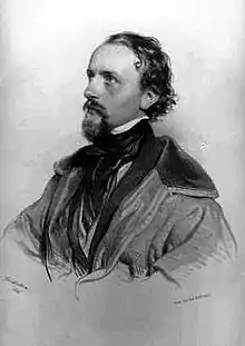 Friedrich Kaiser (3 April 1814, Biberach - 6 November 1874, Vienna) was an Austrian playwright. During his youth he was one of the most popular people in Vienna. Some of his plays were "Hans Hasenkopf" (1835); "Wer wird Amtmann" (1840), "Palais und Irrenhaus" (1863), "Des Krämers Töchterlein" (1862), "Pater Abraham a Sancta Clara" as well as many others. He also wrote the historical novel "Ein Plaffenfeben."[1]