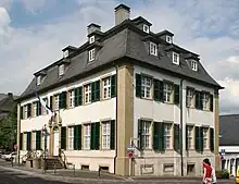 Joachim-Friedrich Martin Josef Merz was born on 11 November 1955 to Joachim Merz (born 1924) and Paula Sauvigny (born 1928) in Brilon in the state of North Rhine-Westphalia in then-West Germany.[12] His father was a judge and a member of the CDU.[13] The Sauvigny family was a locally prominent patrician family in Brilon, of French Huguenot ancestry, and his maternal grandfather was mayor of Brilon. Friedrich Merz is Roman Catholic.[14][15][16][17] Merz was raised in his mother's family home Sauvigny House in Brilon. The house was announced for sale for 2 million euros in 2021.[18][19]