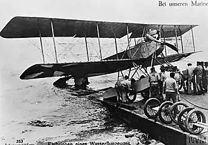 The Friedrichshafen FF.29 was an unarmed maritime reconnaissance floatplane built for the Imperial German Navy's (Kaiserliche Marine) Naval Air Service (Marine-Fliegerabteilung) that was produced by Flugzeugbau Friedrichshafen during World War I. The aircraft entered service in November 1914, mostly conducting maritime patrols over the North Sea and the English Channel, and played a small role in the Raid on Cuxhaven the following month. A FF.29 became the first aircraft to be transported by a submarine when it was used in experiments in January 1915. In May an emergency landing by a FF.29 was the cause of the action off Noordhinder Bank when German forces were searching for the floatplane when they encountered a superior British force. The aircraft was also involved in developing methods of controlling artillery fire from the air.