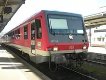 Friedrichshafen Stadt (city) station is the largest railway station of the city of Friedrichshafen on Lake Constance (Bodensee) and a railway junction in the German state of Baden-Württemberg. It has five tracks and is classified by Deutsche Bahn as a category 3 station.[1] Each day it is used by about 160 trains operated by Deutsche Bahn and the Bodensee-Oberschwaben-Bahn (BOB). Ulm–Friedrichshafen railway from Ulm ends at the station, where it meets the Stahringen–Friedrichshafen railway and the Friedrichshafen–Lindau railway. Another major railway station in the city, Friedrichshafen Hafen station (Friedrichshafen port station), which is operated as part of Friedrichshafen Stadt station, was used until 1976 for loading and unloading carriages on the Lake Constance train ferry to Romanshorn in Switzerland.