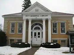 Friendship Free Library, also known as Pitt Memorial Library, is a historic library building located at Friendship in Allegany County, New York. Constructed of yellow brick in 1912, and designed by Otis Dockstader of Elmira, the building is composed of a five- by two bay, one story main block, with a large four by four bay block to the rear. The building features Arts and Crafts style decorative elements. The entrance is sheltered by a monumental gabled portico supported by four Corinthian columns.[2]
