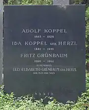 Fritz Grünbaum was married three times. On 1 August 1908, he married Carli Nagelmüller, a fellow cabarettist whom he had met at the Chat noir; they were divorced in December 1914, and she died in 1930.[8] He then married singer Mizzi Dressl.[9] On 10 November 1919 he was married for the last time, to Elisabeth "Lilly" Herzl.[10] She was evicted from their flat in Vienna on 15 July 1938, moving in with a friend, Elsa Klauber; after several forced relocations, they were both deported on 5 October 1942 to the Maly Trostenets extermination camp, where she died on 9 October.[2]