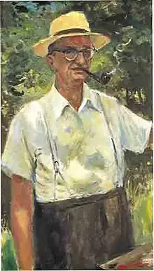 From 1945 to 1972 - interrupted by various voyages to France, Italy, Spain and Holland - Fritz Pümpin has painted in his beloved Jura area of Northwestern Switzerland. His main subjects were landscapes and villages. He has succeeded in over fifty years of work to capture his homeland with convincing strokes of his paintbrush in his post-impressionist style. Portraits, "nature morts", drawings and paintings from his voyages abroad, from his military service and from his archaeological excavations enrich his work.