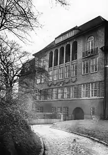 1908, age 39, he accepted an offer as building director for the city of Hamburg, and took up that post in 1909.[1] His designs for the buildings in Hamburg included the Museum für Hamburgische Geschichte[2] and the Staatliche Gewerbeschule Hamburg. These designs till his retirement in 1933 changed the face of the city towards the art and architecture movement of Neue Sachlichkeit and gave an emphasis on the local building material of "brick". The legacy of his achievements are still visible in many districts of Hamburg today, and very often base for the city's current urban design issues. Schumacher died in 1947 in a hospital in Hamburg.[3]