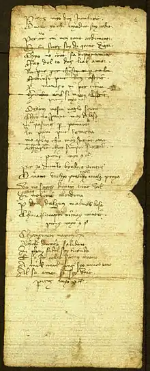 The oldest surviving poems in Friulian date from the 14th century. They are songs of ballads: Piruç myò doç inculurit ("Sweet Blush Pear of Mine", before 1380), Biello dumnlo di valor ("Fair Lady of Worth") and the Soneto furlan ("Friulian Sonnet").[1][2] Vernacular Friulian phrases and spellings occasionally made their way into otherwise Latin documents. Giovanni Frau cites an early example from 1284.[1] Paola Benincà quotes documents from 1355, 1360, 1380 and 1389.[2]