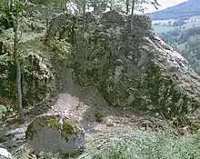 The main castle was formed by a housing tract and a curtain wall. The wall follows the irregularly extending ledge. The massive living area consists of two parts and a smaller west building with irregular floor plan as a residential tower. The thick walls were up to 3 meters (9.8 ft) thick and built from rough cut stone. To the east, adjoining the living area, is an elongated building that served as an administrative and residential building. On the northwest and northeast sides the remains of outlying estates are visible.