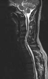 Froin's syndrome – coexistence of xanthochromia, high protein level and marked coagulation of cerebrospinal fluid (CSF). It is caused by meningeal irritation (e.g. during spinal meningitis) and CSF flow blockage by tumour mass or abscess.[1] Stagnation of the CSF within the thecal sac facilitates exudation from the tumour itself and activation of coagulation factors. A clinical test formerly used for evaluation of spinal stenosis is Queckenstedt's maneuver. Nowadays, a magnetic resonance imaging is used for identification of CSF flow obstruction. It often shows the prolongation of T1 and T2 signal in CSF caudal to a level of block.[2] This phenomenon is named after Georges Froin (1874–1932), a French physician who first described it.[3][4]
