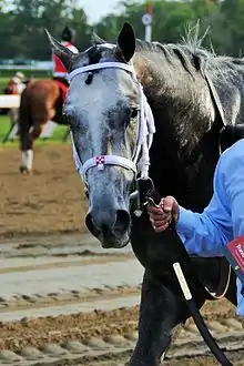 Frosted (foaled April 18, 2012 in Kentucky)[1] is an American Thoroughbred racehorse. In 2016, he set a stakes record while winning the Metropolitan Handicap in a "dazzling performance"[2] and followed up with a win in the Whitney Handicap. Prior to that, despite winning several stakes races, he was best known for finishing behind American Pharoah four times, including a runner-up performance in the 2015 Belmont Stakes.