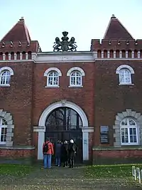 On 4 September 1933, seven months after Hitler’s appointment as Chancellor of Germany, parts of Fuhlsbüttel prison were converted into a concentration camp.[3] It was initially placed under the command of the SA. Most of the inmates were Communists, Social Democrats and other political opponents of Nazism, Jews, Jehovah's Witnesses, Romani, homosexual men and others whom the regime wanted to lock up. In 1936, the Gestapo began running the camp, then called Polizeigefängnis Fuhlsbüttel (police prison). Over 700 people were interned in the camp following Kristallnacht in 1938. Fuhlsbüttel concentration camp was referred to in common parlance as KolaFu (abbreviated from Konzentrationslager Fuhlsbüttel) and became a synonym for oppression and death through hard labor. Fuhlsbüttel was often an initial point of incarceration for prisoners who were sent on to other camps such as Buchenwald, Esterwegen, Neuengamme, Ravensbrück or Sachsenhausen. The camp was liberated on 3 May 1945, by which time over 250 people had been murdered there.