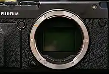 The Fujifilm G-mount is a type of interchangeable lens mount designed by Fujifilm for use in the cameras of their Fujifilm GFX series. These cameras have interchangeable lenses. The respective lenses are designed for 43.8 mm x 32.9 mm medium format sensors.