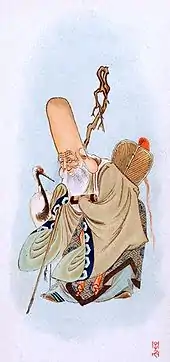 In Japan, Fukurokuju (福禄寿; from Japanese fuku, "happiness"; roku, "wealth"; and ju, "longevity") is one of the Seven Lucky Gods in Japanese mythology.[1] It has been theorized that he is a Japanese assimilation of the Chinese Three Star Gods (Fu Lu Shou) embodied in one deity. Most related in appearance to the Chinese star god Shou, he is the God of wisdom and longevity.[2] According to some, before attaining divinity, he was a Chinese hermit of the Song dynasty and a reincarnation of the Taoist Deity, Xuantian Shangdi. It is said that during his human incarnation, he was a sennin; a immortal who could exist without eating food.