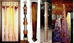 - Merrill Wagner: steel allowed to rust in patterns; slate & rocks, weathered with pigments.[37]