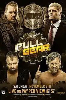 During All Out on August 31, 2019, the American professional wrestling promotion All Elite Wrestling (AEW) announced that their next pay-per-view (PPV) event would be held on Saturday, November 9 at the Royal Farms Arena in Baltimore, Maryland and would be titled Full Gear.[2] The name of the event was a reference to a Being The Elite segment titled "Full Gear" with AEW wrestler "Hangman" Adam Page, a segment in which Page was always in his full ring gear.[3] "Nowhere to Run" by AEW wrestler Chris Jericho's band Fozzy was the official theme song for the event.[4][5] Full Gear was also the first non-WWE pay-per-view event at this arena since the now-defunct World Championship Wrestling (WCW) produced The Great American Bash in 2000 in what was then the Baltimore Arena.