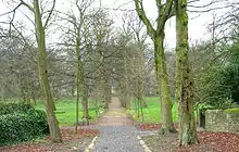 The burial ground or God's Acre stands at the eastern end of the terrace. This also was laid out with elegance and simplicity with the ground, beyond a white triumphal entrance arch, divided into four squares. People were buried in their choir houses rather than together as families. There was one body in each grave. Equality even in death was marked by all occupants having a small and standard gravestone, lying flat on the earth, showing just name and dates. In 1751 the Fulneck elders noted that their "beautiful burial ground was often the reason for deathbed requests for reception" into the Moravian Church. The funeral of a single sister in 1751 involved a procession led by the band of musicians, then the Minister and pastoral labourers, with the Single Sisters’ Labouress dressed entirely in white, the coffin carried by eight single brethren's labourers, the sisters and then finally the brethren.[16] At dawn on Easter Sunday, the congregation would gather in God's Acre to process around the graves with music to celebrate the Resurrection and remember their faithful departed. In 1753, this service attracted a crowd of some 10,000 which proved difficult to manage so the elders chose to cancel the procession in 1754.[17]
