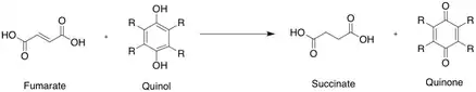 Fumarate reductase (QFR) is a key enzyme induced by anaerobic growth of bacteria.[4] By partaking in fumarate respiration, fumarate reductase performs the last step in the microbial anaerobic respiration. It is a membrane bound protein capable of oxidizing a quinone and passing the released electrons to an awaiting fumarate to be reduced. It is activated and synthesized under low oxygen conditions, when aerobic respiration cannot be performed and the cell must perform anaerobic respiration to grow.[5] This reaction is opposite to the reaction that is catalyzed by the related complex II of the respiratory chain (succinate dehydrogenase (SQR)).[6][7]