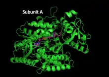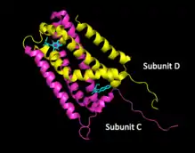 To date, a number of QFR enzymes have been crystalized and the specifics of enzyme structure varies between organisms; however, the overall structure remains similar across different species.[1][7][8] Fumarate reductase complexes include four subunits.[1] Subunit A contains the site of fumarate reduction and a covalently bound flavin adenine dinucleotide (FAD) prosthetic group. It is closely bound to subunit B, which contains three iron-sulfur centers, all placed near to each other and the nearby substrates. Subunit C consists of hydrophobic membrane-spanning, primarily helical segments and is the site of quinol oxidization. In some fumarate reductase structures, one or more heme groups are additionally bound to the C subunit and participate in the electron transfer.[7][5] The D subunit contains hydrophobic alpha helices that span the membrane, but does not participate in the catalytic action of the enzyme. It may be required to anchor the catalytic components of the fumarate reductase complex to the cytoplasmic membrane.[5]
