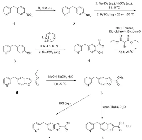 Furegrelate is a synthetic compound that cannot be synthesised by the human body. Several pathways were proposed for the synthesis of Furegrelate sodium salt and related compounds by Johnson et al. and is presented in Figure 1.[2] The nitro group of the starting material, 3-(4-nitrobenzyl)pyridine (1), is reduced using hydrogen over palladium on activated carbon to form 3-(4-aminobenzyl)pyridine (2). In the following step, nitric acid was created in situ by mixing sodium nitrite with sulphuric acid in ice-cold water. The nitric acid attaches to the amino group, forming a diazo group. The hydroxyl group is obtained by stirring the diazo intermediate in a hot aqueous sulphuric acid solution, giving product 3. Product 3 was formylated on the ortho-position relative to the hydroxyl group, using an adjusted Duff reaction using hexamine and trifluoroacetic acid (TFA). In the Duff reaction, the formyl carbon is created from hexamine, leading to product 3-(3-hydroxy-4-formylbenzyl)pyridine, 4. Benzofuran-2-carboxylic acid ethyl ester (5), was obtained using a base-promoted reaction with diethyl bromomalonate and sodium hydride on product 4. To increase NaH solubility, a crown ether was used. Ester product 5 was then transformed to Furegrelate sodium salt 6 using methanol and sodium hydroxide in water. Johnson and co-workers synthesised also two other Furegrelate chemical forms: the free-base 7 and hydrochloric acid salt 8 forms.