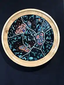 Known for her wall panels, Koral worked in a variety of media such as tiles and statuettes, and also created ceramic-inlaid tables and stools .[4] She started working on ceramics after she was diagnosed with tuberculosis while receiving treatment at a sanatorium in Switzerland.[5] A self-taught artist, her works were mostly ignored during her lifetime although she did create wood-and-ceramic furnishings for the new National Assembly Building in Ankara.[6] Seeking to push the limits of ceramics beyond its function, she was inspired by the art of the ancient civilisations of Turkey, Mexico and East Asia, especially Japan, and her work often combines elements taken from both Western and Eastern artistic traditions.[7]