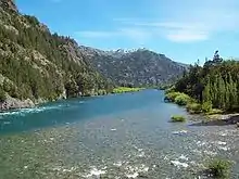 The Futaleufú River is commonly rated by specialized media as one of the best rivers in the world for kayaking and rafting,.[12][13] The river flows in from Argentina, through the town, and empties into the fjord-shaped Yelcho Lake. Day trips and multi-day trips are available on "the Futa" while several of its tributaries, such as the Espolón River, Rio Chico, and the Azul (Blue) River, can be rafted, canoed, or navigated by boat.[14]