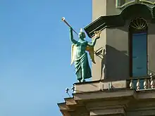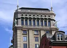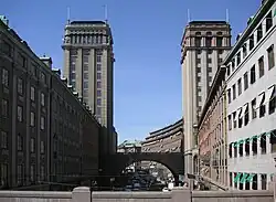 During the 1930s Kornél Tolnai sometimes had his meetings with the L. M. Ericsson board of directors in the South Kings' Tower in Kungsgatan 33, as the company had until 1940 its representative office[7] here. The South Kings' Tower is one of the two towers, it is a 17-storey and 61 m (200 ft) and was built between 1924 and 1925. Together, they are considered the first modern skyscrapers in Europe. The South Kings' Tower was adorned with four towers figures from Roman mythology (Fortuna, Mercury, Neptune and Victoria) created by sculptor Aron Sandberg. Constructor was L. M. Ericsson's real estate company, and the company had until 1940 its representative office here. If you look closely at the tower figures you will see that one of them (Victoria) carries a gilded Ericsson phone with the letters "LME". In the top of the tower was until 1963 the restaurant Pagod which was a temperance restaurant, decorated by Aaron Sandberg in Chinese theme, which was run by the Salvation Army.