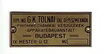 - a) manufactured in his own workshop, called "Dipl.ing. GK Tolnai Okl. Gépészmérnök" (M. Sc. G K Tolnai Master of Science Mechanical), in Mester útca 13, Budapest IX (1928–1931),