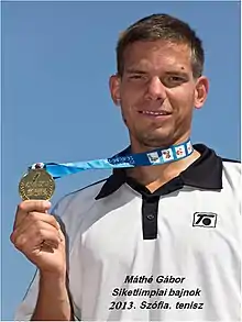 Gábor Máthé (born July 2, 1985, in Debrecen, Hungary) is a Hungarian male tennis player, who competes in the men's single and double during his career. His team is Tatár Tennis Club[1] in Debrecen, Hungary. He is best known for winning the men's single tennis final on August 2 at the 2013 Summer Deaflympics in Sofia, Bulgaria, with a three set victory over Mikaël Laurent from France.