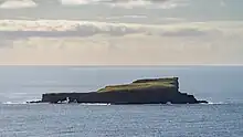 Gáshólmur Islet with sheep grazing, seen from North-east, September 2023.