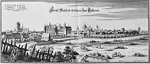 Güstrow Palace is quadrangular in shape. Some of the old furniture has been removed to Schwerin and other places following the death of Magdalena Sybilla which marked the end of the Güstrow lineage. In one part of the palace, there are well preserved Flemish paintings; one particular painting is of a Dutchman smoking. A theatre is in good shape with well preserved original stucco paintings. The stucco ceilings are retained in their original form in the palace. The banquet hall's ceiling has unique stucco paintings of hunting scenes which are adaptations from Dutch copper engravings.[2] The medieval rooms in the basement of the palace, which are vaulted, have many artifacts of the medieval period of Germany. The art chamber contains exhibits of hunting and ceremonial weapons. The refurbished former dining halls, residential and reception rooms have exhibits of paintings of Cranach, Marten de Vos, and Tintoretto. Antique ceramic vessels and a large number of glass items are on display in the former chamber of the duchess. There are also displays from the 19th to 21st centuries.[2]