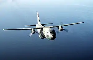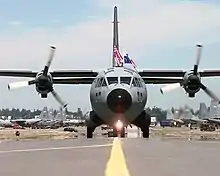 The G.222 is a twin turboprop-engine tactical military transport aircraft, and is designed to be capable of transporting equipment or troops in combat zones and operating with minimal ground support.[12] Early production aircraft were exclusively fitted with the General Electric T64-GE-P4D turboprop engine, the licence-built Rolls-Royce Tyne was made available as an alternative powerplant for the type from 1980 onwards, while the Allison T56 was another proposed powerplant for the type.[7][9] Due to features such as double-slotted flaps, stacked brakes, and reversible propellers,[19] the G.222 has excellent short landing capabilities and is able to land in as little as 1,800 feet.[20] It was designed to be integrated with the larger, commonplace Lockheed C-130 Hercules.[5]
