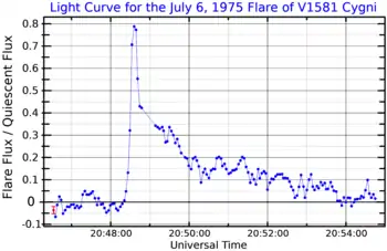 A blue band light curve for a flare of V1581 Cygni. The left-most point shows a 1 sigma error bar. Adapted from Cristaldi and Rodonò (1976)[1]