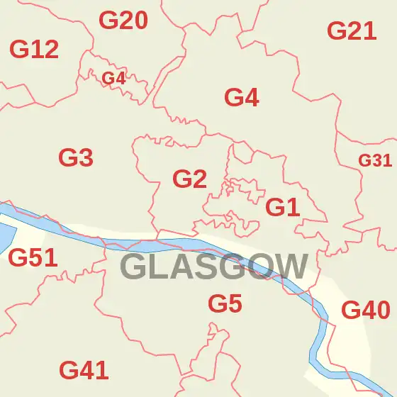 From 1923 until the introduction of the national postcode system in the late 1960s, Glasgow was divided into (mostly) numbered postal districts for its central and surrounding parts identified by compass-point letters: C1–C5 (corresponding to current postcode districts G1–G5), W1–W5 (G11–G15), NW (G20), N1–N3 (G21–G23), E1–E4 (G31–G34), SE (G40), S1–S6 (G41–G46) and SW1–SW3 (G51–G53).[3][4]