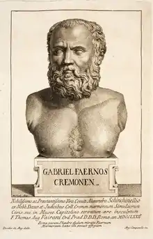 The humanist scholar Gabriele Faerno, also known by his Latin name of Faernus Cremonensis, was born in Cremona about 1510 and died in Rome on 17 November 1561. He was a scrupulous textual editor and an elegant Latin poet who is best known now for his collection of Aesop's Fables in Latin verse.