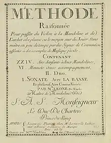 Methode raisonnee pour passer du violon a la mandoline et de l'archet a la plume, ou Le moyen seur de jouer sans maitre en peu de temps par des signes de convention assortis a des exemples de musique facile. [Translation: Method reasoned to pass from the violin to the mandolin and the bow to the feather, or the means of playing without master in a short time by signs of convention matched with examples of easy music.]