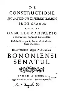 - Manfredi, Gabriello (1707). De constructione aequationum differentialium primi gradus (in Latin). Bononiae: typis Constantini Pisarii. Retrieved 13 June 2015.