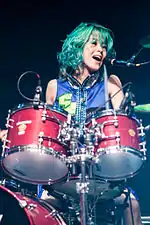 Also in February, Angelina 1/3 joined as a "microphone performer".[61] With a long-time desire to be a "singer", she was initially a little disappointed by the use of this descriptor, but she was convinced by her bandmates that she was free to express Gacharic Spin not only by singing.[62] Koga invited her to audition after seeing her perform at a school festival;[62] she was seventeen years old, still in school and had no professional stage experience when she joined. The following March, yuri – formerly of the disbanded Lagoon – joined as drummer. With yuri drumming, Hana switched to guitar and continued as vocalist.[63]