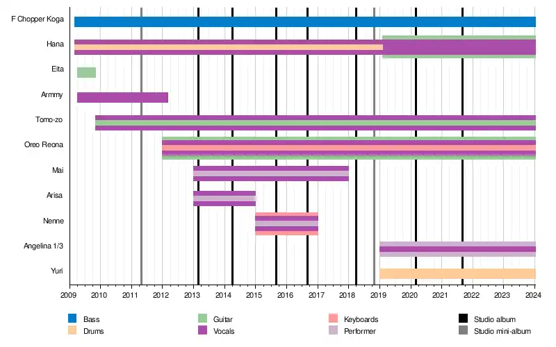 With lead vocalists Hana also drumming and Reona playing keyboards – stationary instruments – keeping them from interacting with the audience, in 2013, "performers" Mai (Mai Ichigo) and Arisa were recruited to fill the role. Mai initially joined alone, with Arisa following shortly after. They came to be known as the "Gacha Gacha Dancers",[2][3][19] with Mai also acting as choreographer.[14]