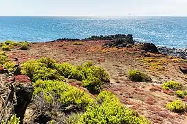 Coastal plant communities are generally low-growing shrubs and herbs which are tolerant of drought and salt spray. Typical plants include the shrubs saltbush (Cryptocarpus pyriformis) and Maytenus octagona. Herbaceous seashore plants include the widespread beach morning glory (Ipomoea pes-caprae) and Sesuvium portulacastrum, and the endemic Galápagos carpet weed (Sesuvium edmonstonei).[1]
