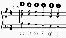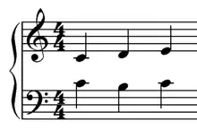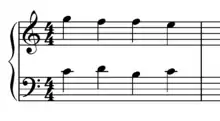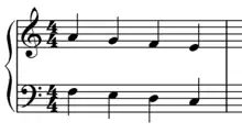 The Fenaroli features four events, with the melody featuring a descent from scale degree 4 to scale degree 3 followed by an ascent from scale degree 7 to scale degree 1.[1] The Fenaroli bass features a stepwise ascent from scale degrees 7 to 3. Another common Fenaroli melody is scale degree 2 to scale degree 3, then scale degree 7 to scale degree 1, which creates a canon with the bass.[17] A countermelody exists for the Fenaroli, as taught by Francesco Durante.[18]