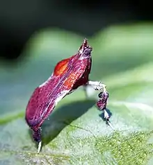 The larvae feed on the leaves of Buxus species. They tie together and eat dead leaves of their host plant.