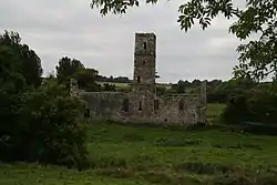 Also located just outside the village is Moor Abbey. This Franciscan friary was founded in the thirteenth century by Donach Cairbreach Ua'Briain.[6] The only standing building from site is the friary's church, which was built in 1471.[7] The site had a tumultuous history, matching the ebbs and flows of Irish politics and religious freedoms, and was inhabited until 1748, though with periods of desertion. Present in the church is the remains of a tomb, which is perhaps that of the founder.