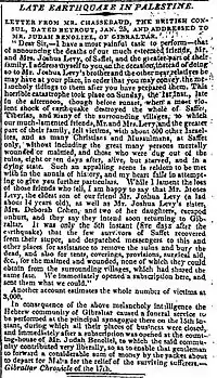 A 1977 assessment of the event that was published in the Bulletin of the Seismological Society of America had the epicenter just north of the city of Safed and the magnitude of 6.25–6.5, but in 1997 seismologist Nicholas Ambraseys argued that the event may have been more substantial. The event was well-documented by the nineteenth-century missionary, archaeologist, and author William McClure Thomson. The region in which the earthquake occurred was formally part of the Ottoman Empire but at the time, it was under control of the Egyptians, who were occupying after they had seized it during conflict.