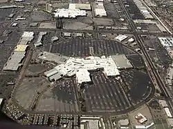 The mall initially had a southwestern theme and skylights.[20] Frommer's described it as the "most aesthetically pleasing" of the Las Vegas Valley's malls.[39] The 600-seat food court,[40] decorated with chess-piece topiaries,[20][23] included 12 eateries,[41] such as Cinnabon, Dairy Queen, and Hot Dog on a Stick.[20][42] The mall also had two full-service restaurants.[20] The parking lot contained 6,000 spaces, and valet parking was offered at the time of the mall's opening.[43]