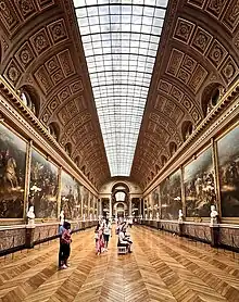 The Galerie des Batailles (French: [ɡalʁi de bataj]; English: "Gallery of Battles") is a gallery occupying the first floor of the Aile du Midi of the Palace of Versailles, joining onto the grand and petit appartement de la reine. 120 m (390 ft) long and 13 m (43 ft) wide, it is an epigone of the grand gallery of the Louvre and was intended to glorify French military history from the Battle of Tolbiac (traditionally dated 496) to the Battle of Wagram (5–6 July 1809).