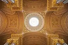 The architects Pierre-François-Léonard Fontaine[1] and Frédéric Nepveu created a solemn decorative scheme for it, with a wide cornice supporting a coffered painted ceiling with entablatures supported by Corinthian columns along the length of the gallery. 13 bronze tablets on the wall are inscribed with the names of princes, admirals, constables, marshals and warriors killed or wounded whilst fighting for France. There are also busts placed on supports against the columns and between the paintings.