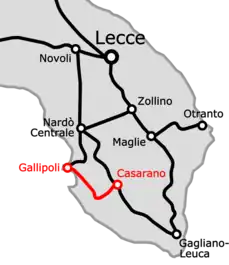 The Gallipoli–Casarano railway is an Italian 22-kilometre (14-mile) long railway line, that connects Gallipoli with Casarano and Gagliano del Capo. The route operates through the region of Apulia.