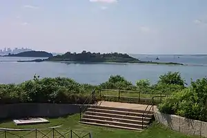 Gallops Island (center) as viewed from Fort Warren on Georges Island. The skyline of downtown Boston can be seen to the top left, over the tip of Long Island.